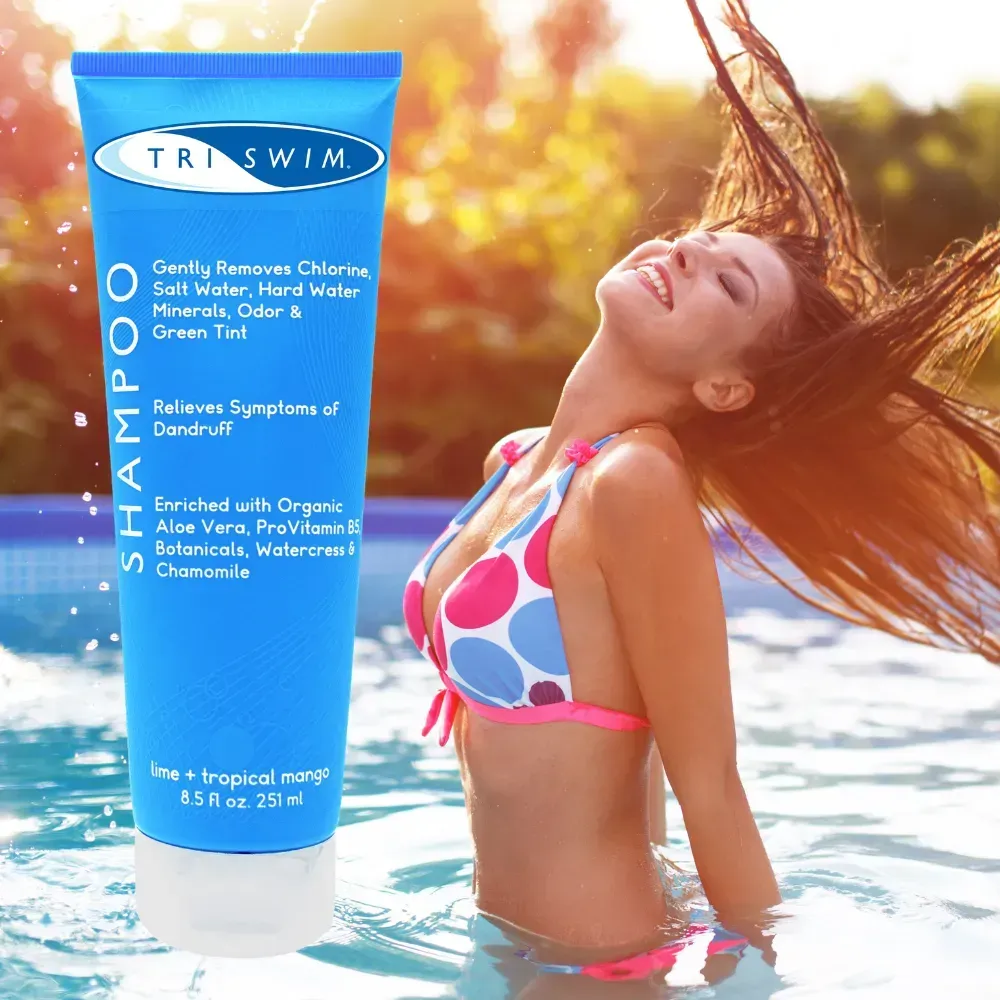 Шампунь після плавання TRISWIM – це перший крок у відновленні пошкоджених волокон волосся після плавання в басейні. Пом’якшує сухе волосся та шкіру голови після купання в хлорованій або солоній воді. Шампунь TRISWIM можна використовувати щодня, він також чудово підходить після інших фізичних навантажень. Вся лінія косметики TRISWIM містить натуральні інгредієнти, такі як органічне алое віра та провітаміни. Це дозволяє нейтралізувати шкідливий вплив і дратівливий запах хлору на наше волосся і шкіру. Натуральні компоненти додатково захищають шкіру і волосся від висихання, в тому числі під час наступного купання в басейні.